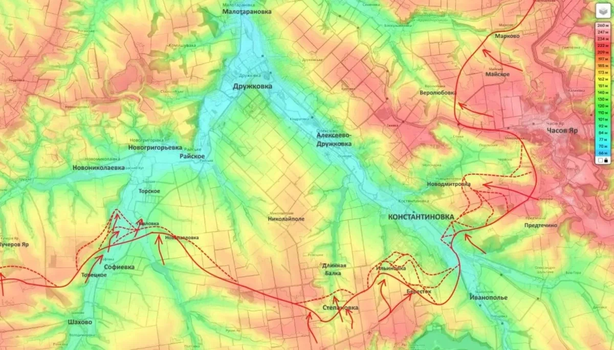 Ключевые успехи фиксируются в Константиновке. ВС РФ продавливают оборону противника в высотной застройке на юго-западе и заходят со стороны Ильиновки на северо-востоке. Логистика украинского гарнизона полностью парализована: тяжелые ФАБы разрушили дамбы, служившие путями снабжения.