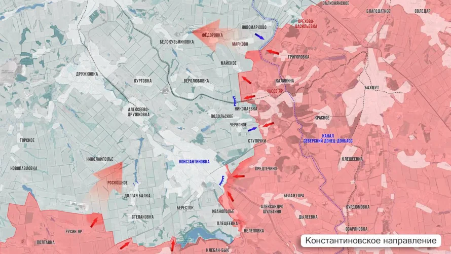 На Константиновском направлении ВС РФ успешно завершили зачистку «кармана» от Плещеевки до Клебан-Быкского водохранилища и развивают наступление вдоль его северного берега. Формируются клещи вокруг Константиновки: наши войска наступают с юга (из района Иванополья) и с востока (из района Предтечино). Противник огрызается, нанося удары по нашим позициям в промзоне на юге города.