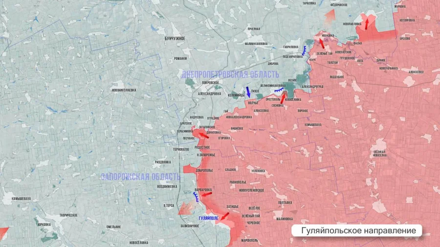 Южнее Гуляйполя фронт также пришел в движение. Российские бойцы наступают выше населенных пунктов Марфополь и Дорожнянка. В результате грамотных маневров удалось объединить плацдармы западнее Нового Запорожья и Доброполья. Вектор атаки направлен в сторону Косовцево и Рождественского.