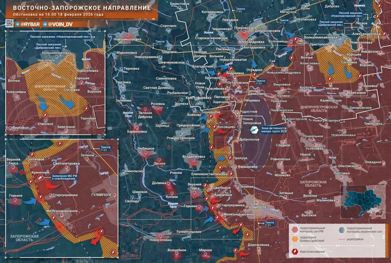 - Красноармейский (Покровский) участок: Идет продвижение вдоль трассы на Павлоград с целью обхода позиций ВСУ у Гришино. Между Родинским и Белицким российские части продвигаются по лесополосам, осуществляя южный охват Белицкого.