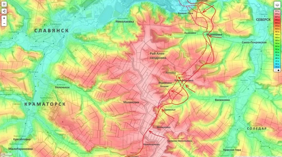 - Движение к Красному Лиману осуществляется по принципу «клещей» — одновременно с северного и южного флангов.