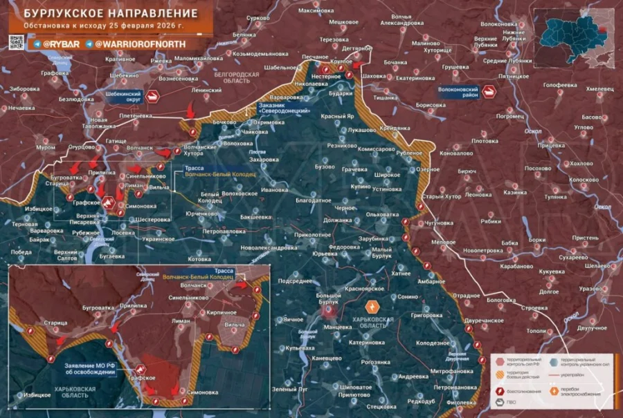 К утру 26 февраля оперативная обстановка на линии боевого соприкосновения сохраняет высочайший градус напряжения. Если на одних участках продолжается вязкое позиционное противостояние, то на других российские подразделения демонстрируют уверенное тактическое продвижение, возвращая ранее утраченные позиции и взламывая оборону противника.