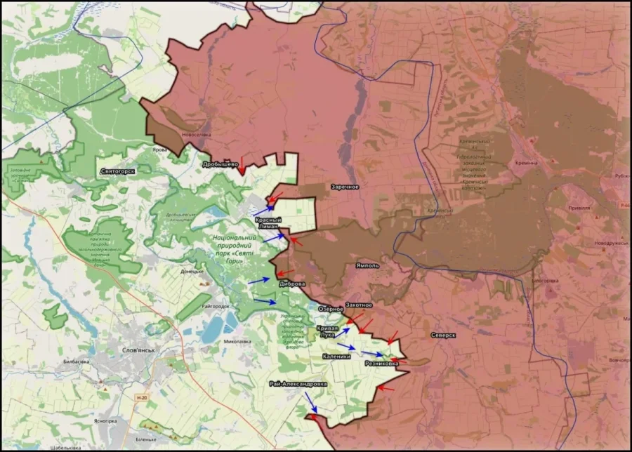 Продолжается планомерная работа по ликвидации «карманов» на севере и северо-востоке Красного Лимана. Ожесточенные бои идут в районе Александровки, Яровой и Соснового, а также на подступах к Святогорску и за Дробышево. В последнем российские силы постепенно вытесняют противника, бои идут буквально за каждое строение.