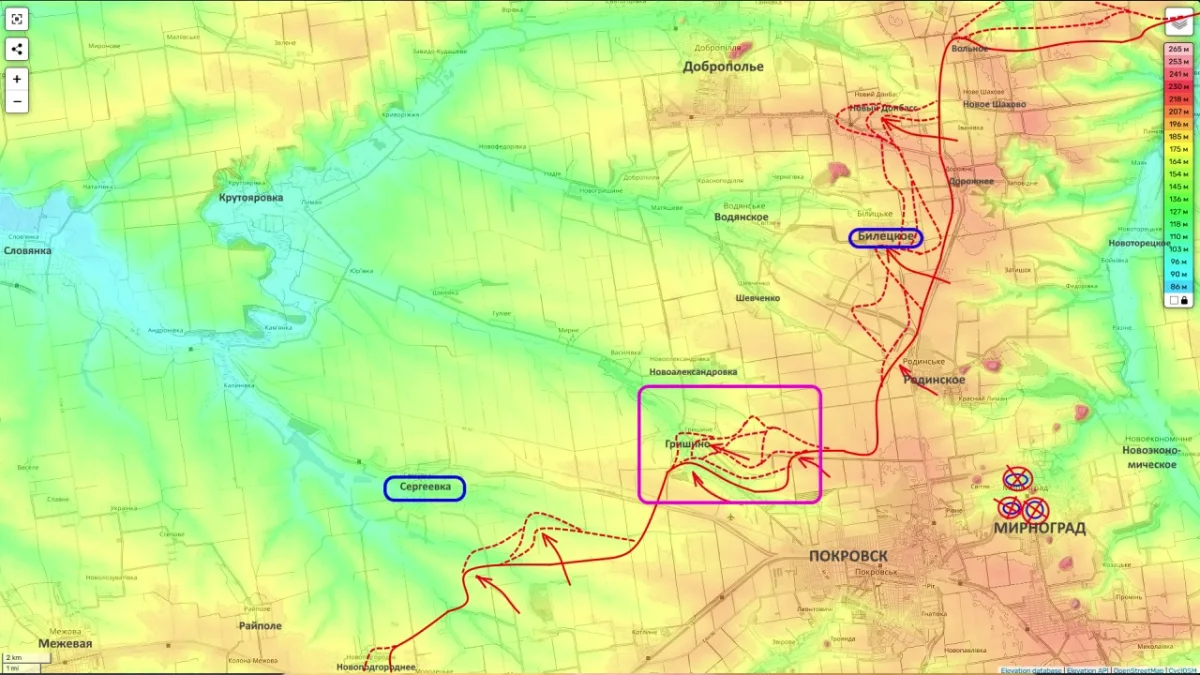 Российские подразделения продвигаются по линии Новый Донбасс — Белицкое — Гришино, усиливая давление на Сергеевку. Развивается наступление на Константиновку: по имеющимся данным, около четверти территории города уже находится под контролем российских сил.