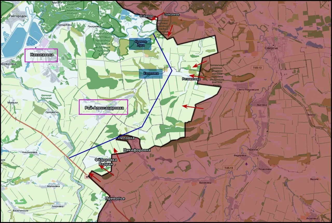 На Северском направлении идет подготовка к штурму Федоровки Второй — российские войска стягивают кольцо по периметру поселка. Западнее Приволья передовые отряды вышли к каналу Северский Донец — Донбасс. Форсирование этой водной преграды откроет путь к Тихоновке и Малиновке.