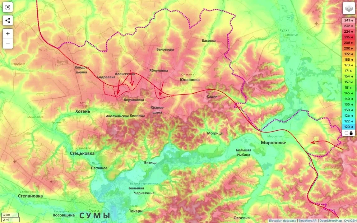 Похожим образом он характеризует и действия у границы Сумской области. По версии Подоляки, российские силы используют здесь нехватку личного состава у противника, занимая отдельные приграничные населённые пункты и вынуждая украинскую сторону вести арьергардные бои, в значительной степени опираясь на беспилотники.