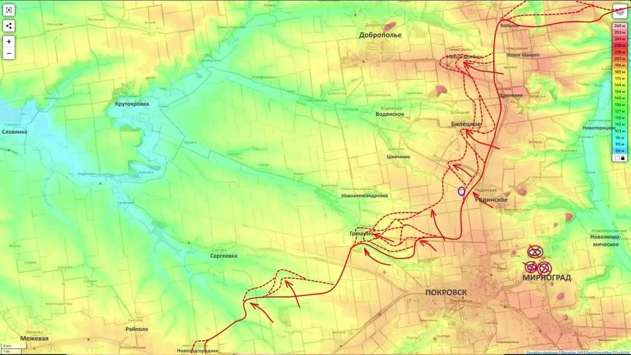 На Новопавловском направлении, если верить этой оценке, сейчас наблюдается оперативная пауза. Зато к северу, в районе Покровска и Мирнограда, по словам Подоляки, развернулось одно из наиболее тяжёлых встречных сражений последних дней. Он описывает бои в полосе от Гришино до Нового Донбасса как чрезвычайно напряжённые, с постоянными атаками и контратаками обеих сторон. Украинское командование, по его версии, перебрасывает сюда штурмовые подразделения с юга, пытаясь сорвать российскую наступательную кампанию, а наиболее ожесточённые столкновения идут в районе Гришино, Белицкого и Нового Донбасса.