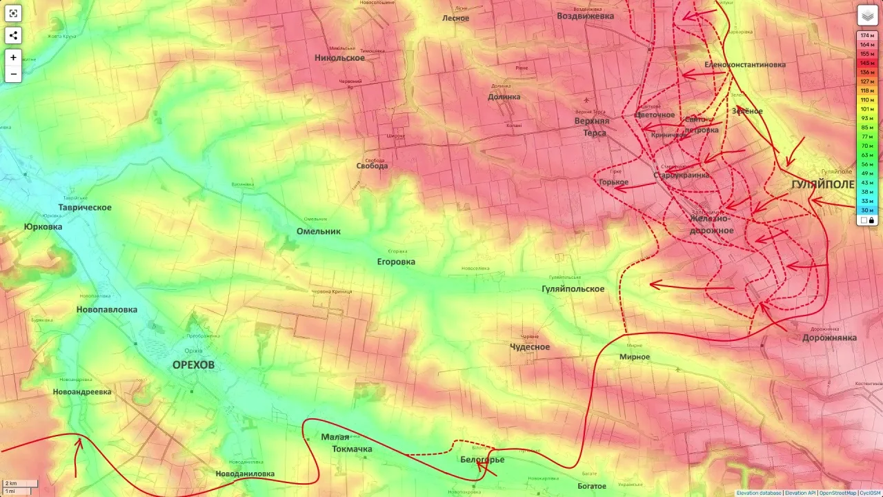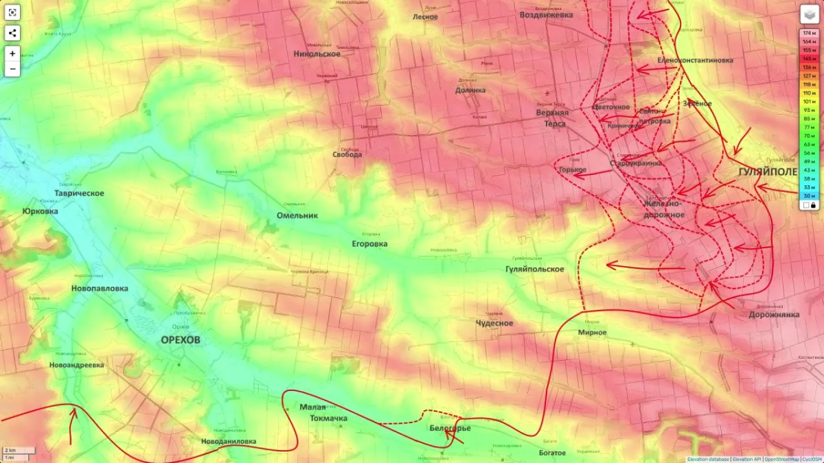 Южнее, в полосе группировки «Восток», по оценке Подоляки, сохраняется более активная динамика. Он указывает, что подразделения 35-й армии продолжают давить от района Гуляйполя в направлении Верхней Терсы, пытаясь охватить этот населённый пункт и закрепиться на его территории.