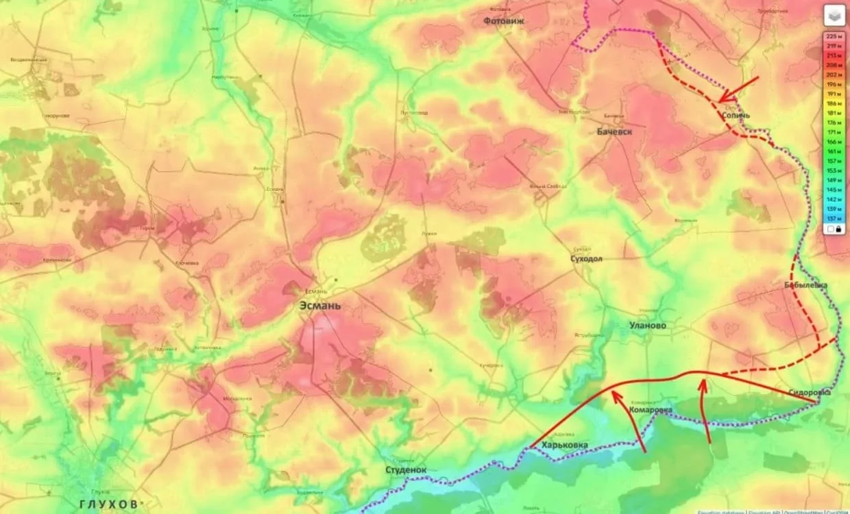 Активные боевые действия продолжаются и на северных участках фронта. На Глуховском направлении в Сумской области российским частям удалось занять населенный пункт Сопычь, пытаясь выровнять фронт по линии Бачевск — Уланово. По информации Юрия Подоляки, украинская сторона де-факто признает потерю села, хотя официальных комментариев от Минобороны РФ пока не поступало.