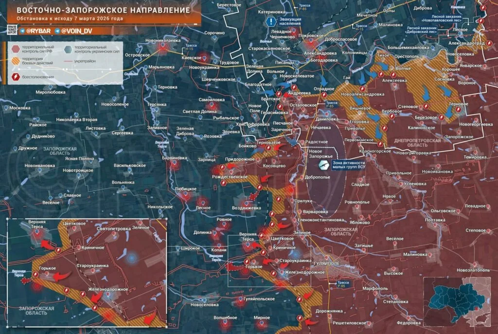 Успехи фиксируются и на Гуляйпольском участке. Российские войска с боями продвигаются к самому Гуляйполю, параллельно отражая контратаки ВСУ на линии Верхняя Терса – Воздвижевка. Есть тактические успехи северо-западнее Рождественского (в районе Зарницы).