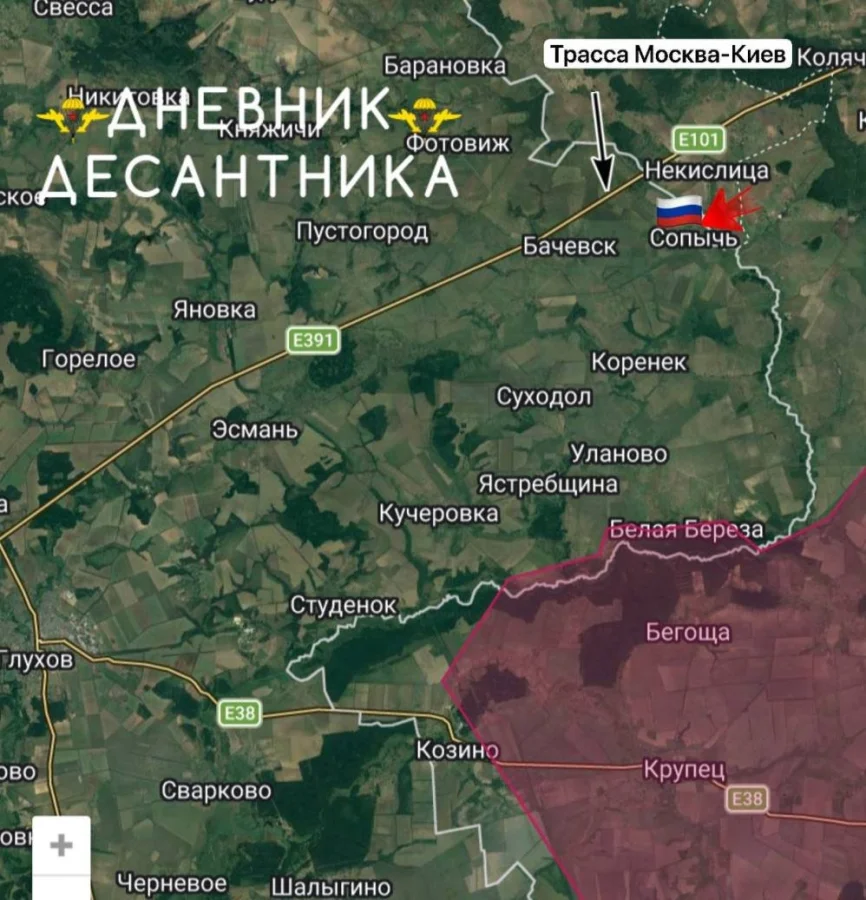 Ожесточенное сражение разворачивается к югу от рубежа Юнаковка — Кондратовка в Сумской области. После недавнего освобождения села Сопычь, ВС РФ продолжают выдавливать противника вглубь региона. За сутки зафиксировано продвижение на четырнадцати участках в Сумском районе и на двух — в Глуховском (общее продвижение до 300 метров).