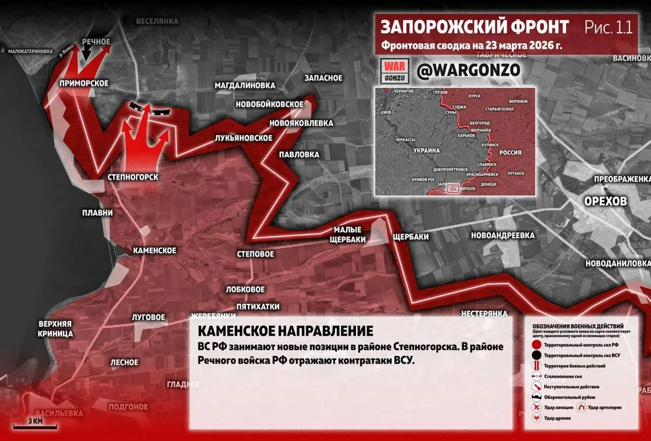 Как сообщает MAX-канал «WarGonzo» в своей оперативной утренней сводке на 23 марта, общая диспозиция на фронтах выглядит следующим образом: