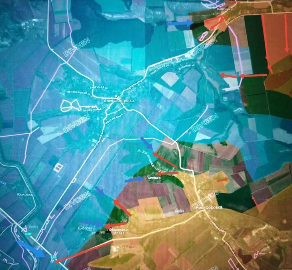 Подразделения Группировки войск «Юг» расширяют зону контроля. Российские штурмовики продвигаются к южным окраинам Рай-Александровки, ведя ожесточенные встречные бои в районе Липовки и реки Васюковка. Как подтверждает военный эксперт Андрей Марочко, атака на Рай-Александровку идет также с северо-востока (от Калеников) на юго-запад.