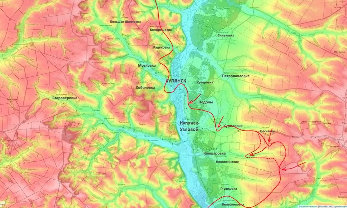 - На западном берегу реки Оскол (северная часть Купянска) идут жестокие встречные бои. ВС РФ возвращают контроль над ранее утраченными позициями, в том числе в районе Центральной городской больницы.