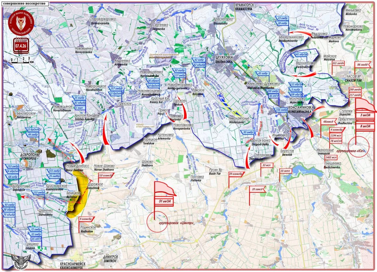 Центральная дорога, необходимая для ротации и подвоза боекомплекта, находится под плотным колпаком российских беспилотников. С воздуха уничтожается любой транспорт — от одиночных пикапов до колонн. Зона поражения неумолимо ползет на север к самой Дружковке.