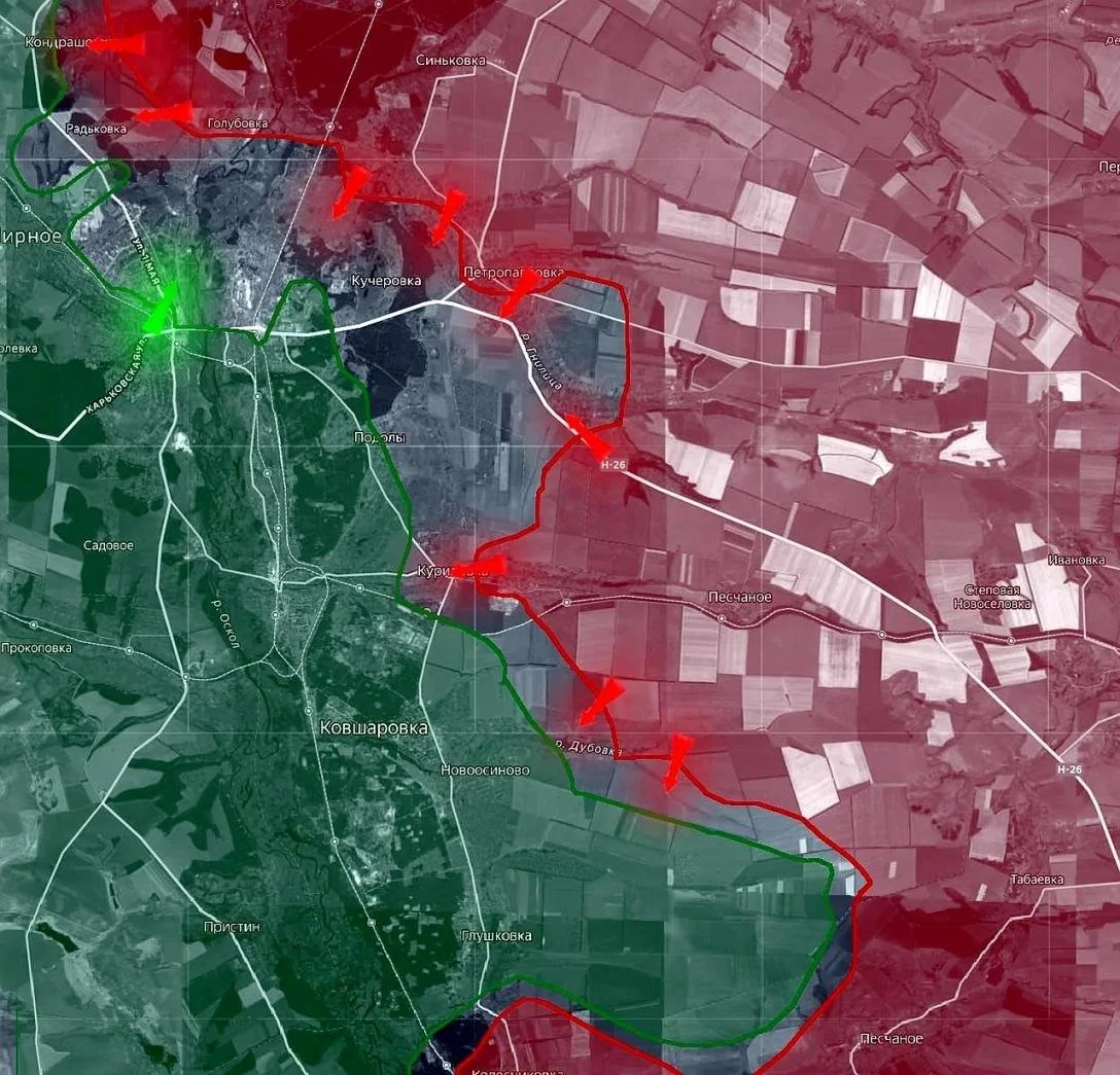- Ковшаровка: Идут интенсивные штурмовые действия в районе этого поселка городского типа, расположенного всего в полутора километрах южнее важнейшего логистического узла — ПГТ Купянск-Узловой.