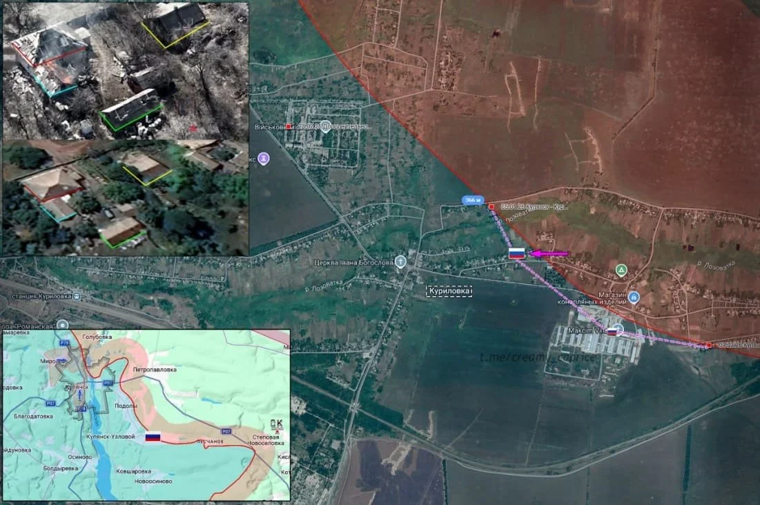 Геопривязка кадров с мест боев подтверждает присутствие наших войск в жилой застройке Куриловки и их постепенное продвижение к центру населенного пункта. Следующая стратегическая цель на этом векторе — прорыв к важнейшему транспортному узлу Купянск-Узловой.