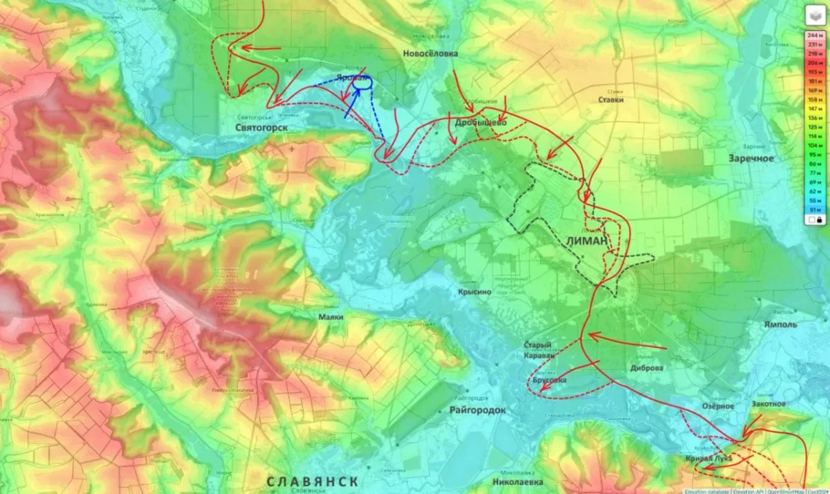На Краснолиманском направлении идут тяжелые бои за сам Красный Лиман, который является важнейшим логистическим узлом. По данным профильных каналов, ВС РФ взяли под контроль территорию между Заречным и Красным Лиманом, а бои сместились к восточной части города.
