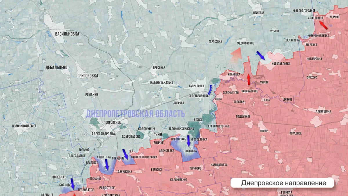 Тяжелые бои зафиксированы в районе Никифоровки. Значимый успех достигнут восточнее Рай-Александровки: российские штурмовые группы прорвались через сложный рельеф балки и закрепились в части леса Западный.
