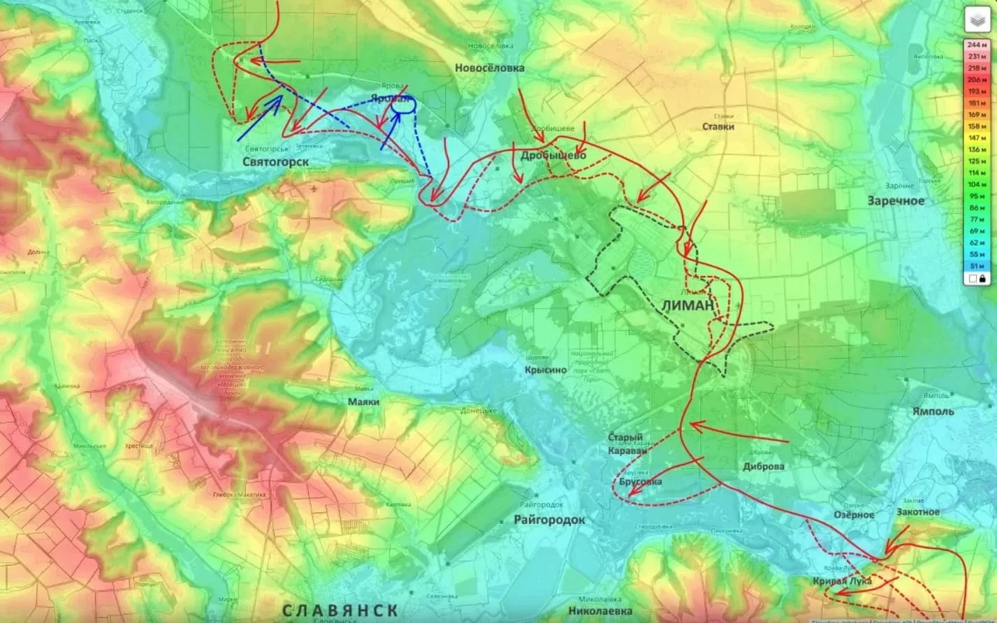 Аналогичная тактика «лесного просачивания» применяется западнее Лимана и в районе Дробышево. Динамика продвижения здесь создает прямую угрозу оперативного окружения местной группировки ВСУ. В среднесрочной перспективе этот маневр открывает ВС РФ прямую дорогу для широкого охвата Славянска.