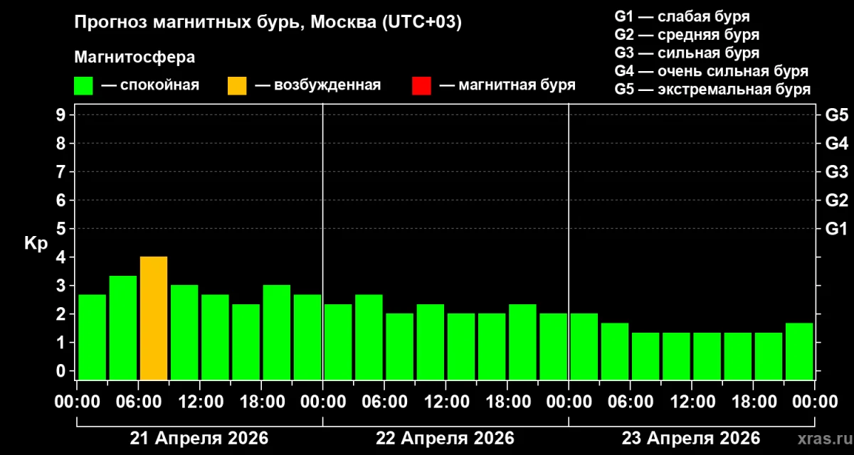 Магнитная буря 21 апреля 2026 года: два пика геоударов и напряжённый день для метеочувствительных россиян
