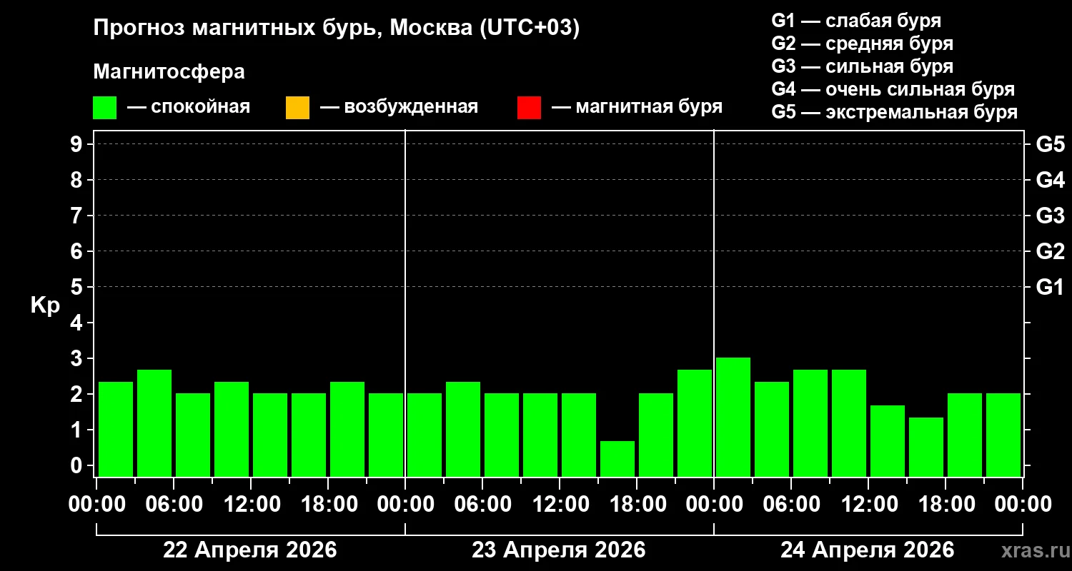 В пятницу, 24 апреля, К-индекс может кратковременно коснуться отметки 3 ближе к полуночи, что также не дотягивает даже до классификации слабой магнитной бури (G1 начинается с К-индекса 5).