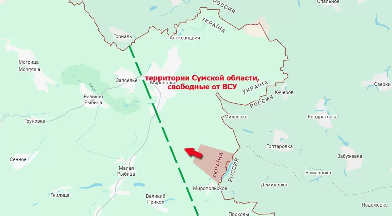 Поступательное движение ВС РФ наблюдается и в приграничной Сумской области. К середине дня российская армия перевела под свой контроль очередной участок площадью около 7 квадратных километров — приграничную «трапецию» к северу от ранее освобожденного Мирополья.