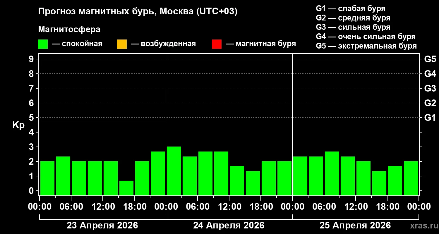- 24 апреля, пятница: Геомагнитный фон останется стабильным. Kp-индекс не превысит 3 баллов. Лишь особо чувствительные люди могут ощутить легкий упадок сил, но в целом конец рабочей недели пройдет благополучно.