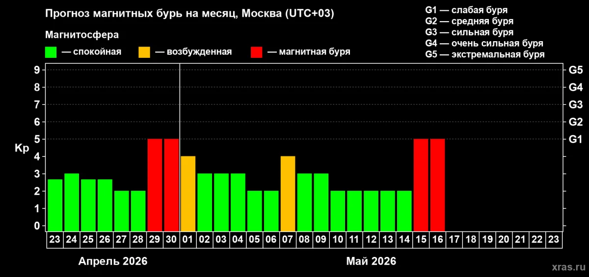 - 29 и 30 апреля магнитосфера окрасится в красный цвет. Ожидается магнитная буря уровня G1 (Kp-индекс достигнет 5 баллов). В этот период выбросы солнечной плазмы достигнут Земли, вызвав заметные колебания магнитного поля.