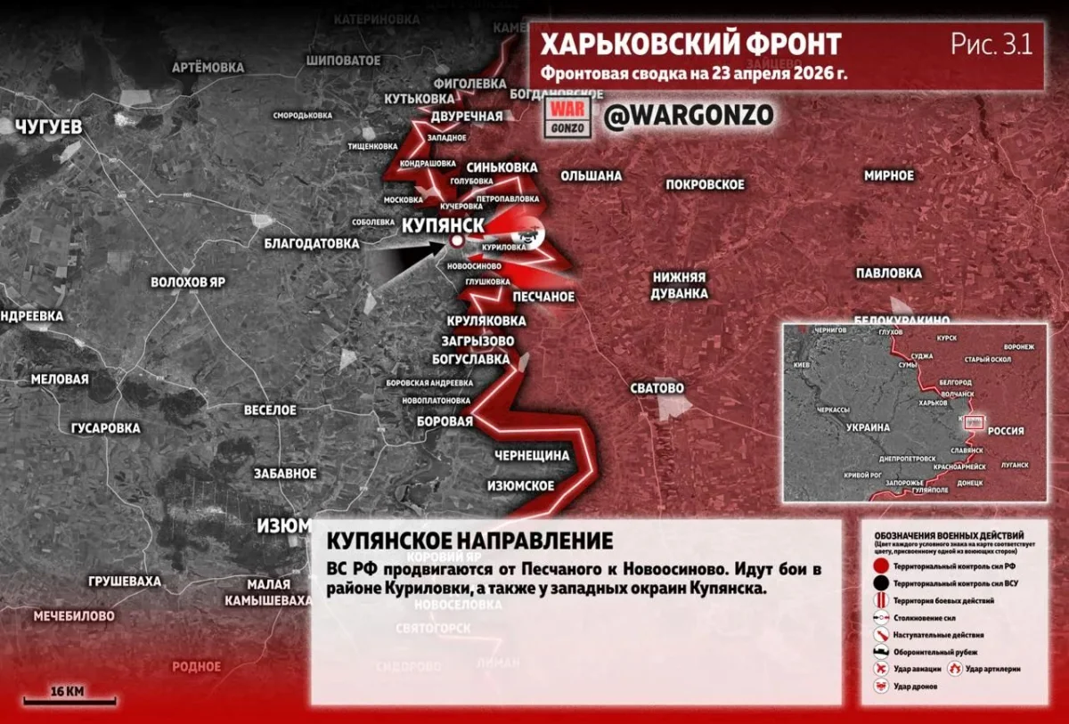 Купянск, 23 апреля 2026 года: ожесточённые бои в городе и на подступах — свежая сводка с фронта и карта боевых действий