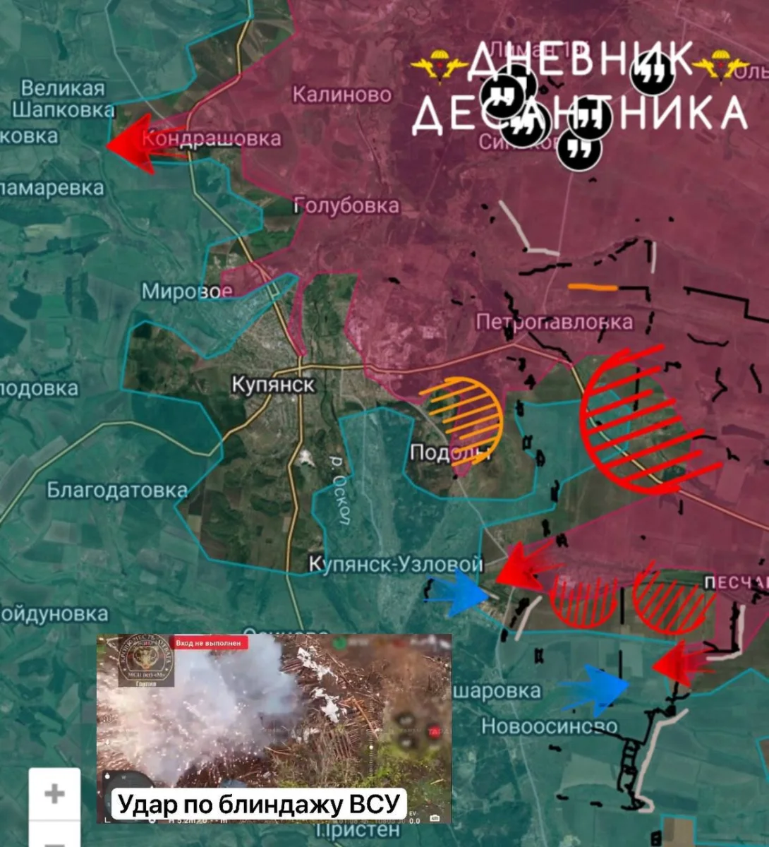 В данный момент свежие подкрепления ВС РФ продолжают стягиваться к Купянску и Петропавловке. Российская армия реализует грамотный охват опорных пунктов врага, продвигаясь к стратегически важному Купянск-Узловому по маршруту Колесниковка — Новая Кругляковка — Ковшаровка — Новоосиново.