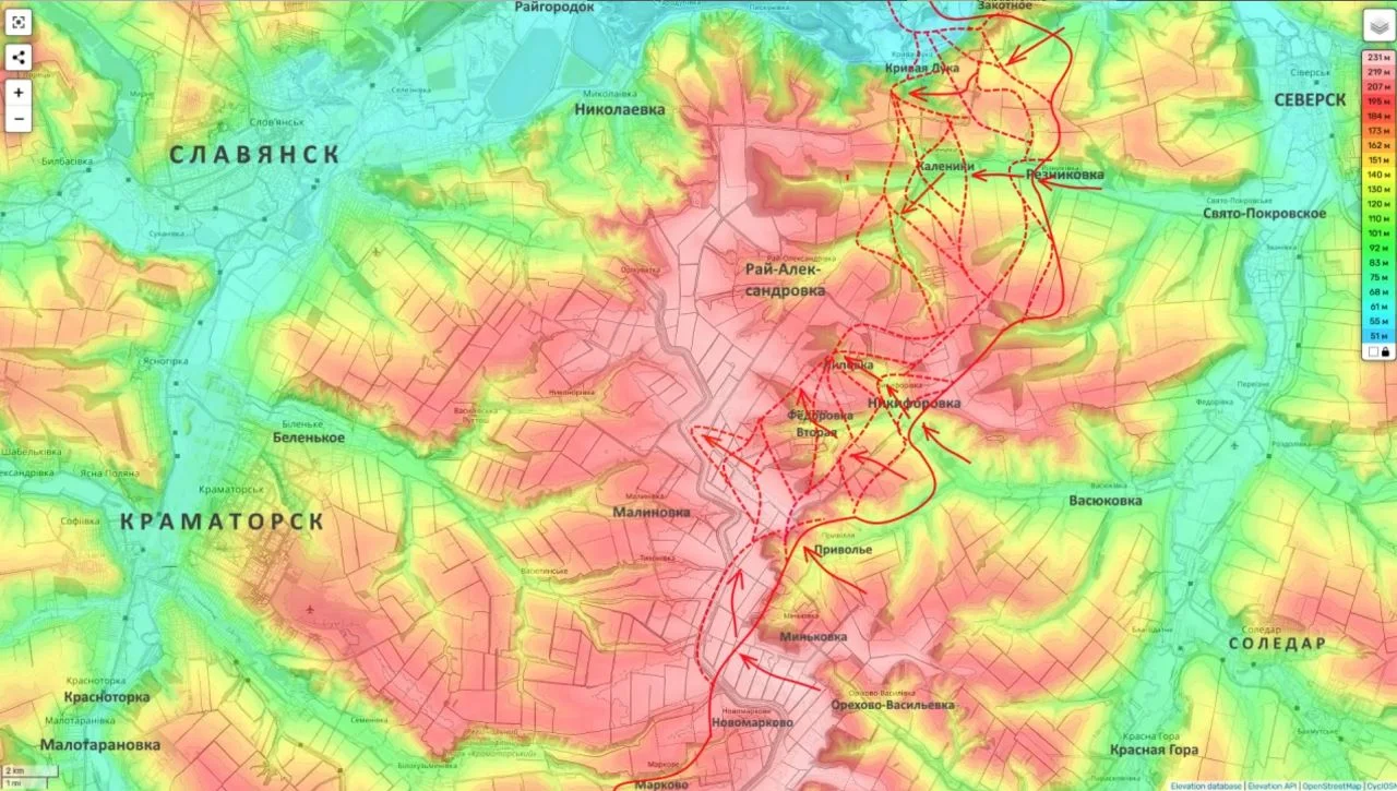 На Славянско-Краматорском направлении инициатива прочно удерживается российской армией. Интенсивность боевых действий здесь возрастает с каждым днем. Российские войска методично продавливают позиции ВСУ на обоих флангах, реализуя тактику обхода основных укрепрайонов противника вдоль стратегической трассы М-03.