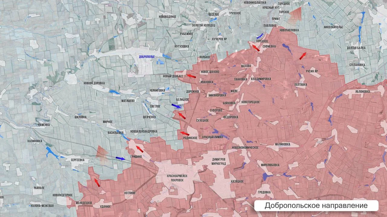 Взятие под контроль Белицкого и Родинского позволяет выстроить плотный юго-восточный охват Доброполья. Однако штурм города в лоб с этого направления затруднен: противник опирается на сложную систему оборонительных рубежей и сеть терриконов.