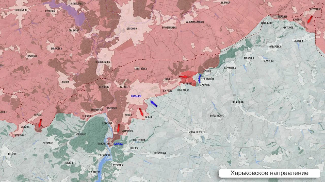 На Харьковском участке ВС РФ реализуют смелый замысел на западном фланге: продвижение в лесных массивах у Ветеринарного создает реальную угрозу удара во фланг группировки ВСУ в Шевченко, Граново и Казачьей Лопани. Расширяется российский плацдарм между государственной границей и правым берегом реки Волчья.