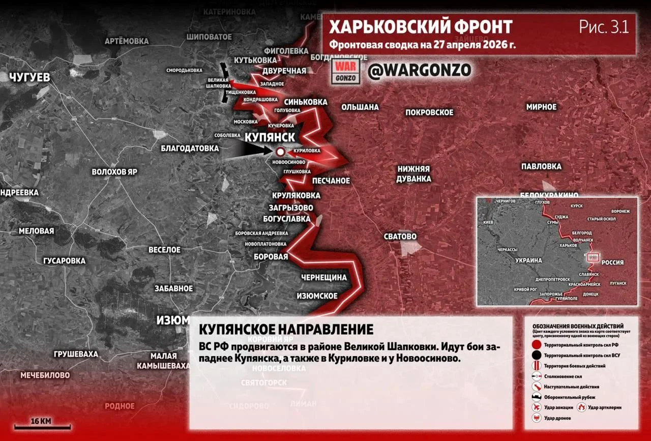 Идут бои на западных подступах к Купянску, а также в Куриловке и Новоосиново. При этом, по информации MAX-канала «Два майора», украинская сторона фиксирует инфильтрацию малых штурмовых групп ВС России в направлении Купянска-Узлового.