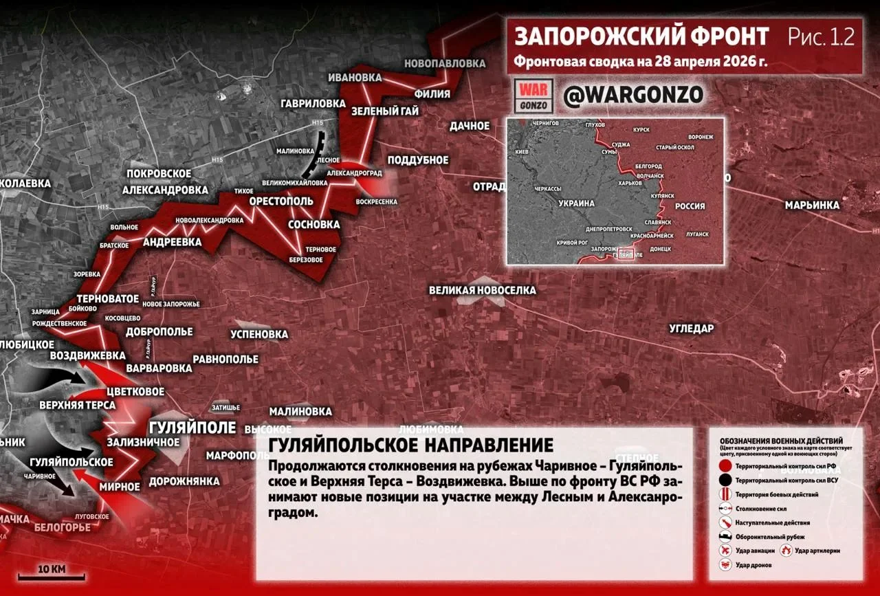 Боевые действия по всей линии соприкосновения носят ожесточенный характер. Армия России планомерно реализует стратегию по уничтожению логистических узлов противника и расширению зоны контроля. По состоянию на 28 апреля 2026 года, инициатива прочно удерживается нашими бойцами.