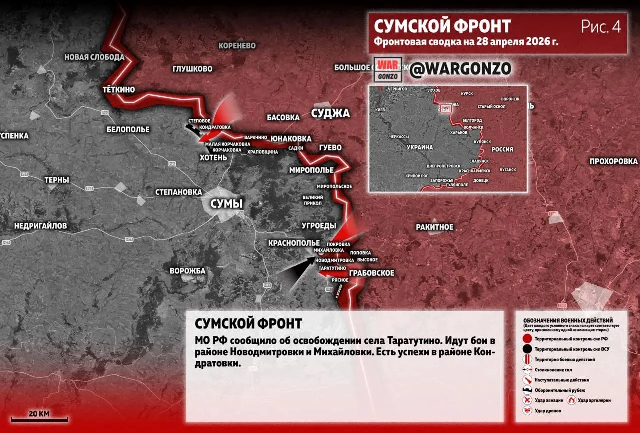 В Краснопольском районе штурмовики 34-й горной бригады в ходе тяжелых боев освободили село Таратутино, выбив оттуда подразделения 425-го штурмового полка и теробороны противника. Это позволило сформировать выступ вглубь обороны ВСУ.