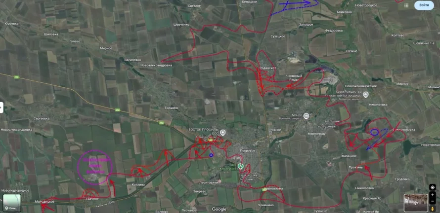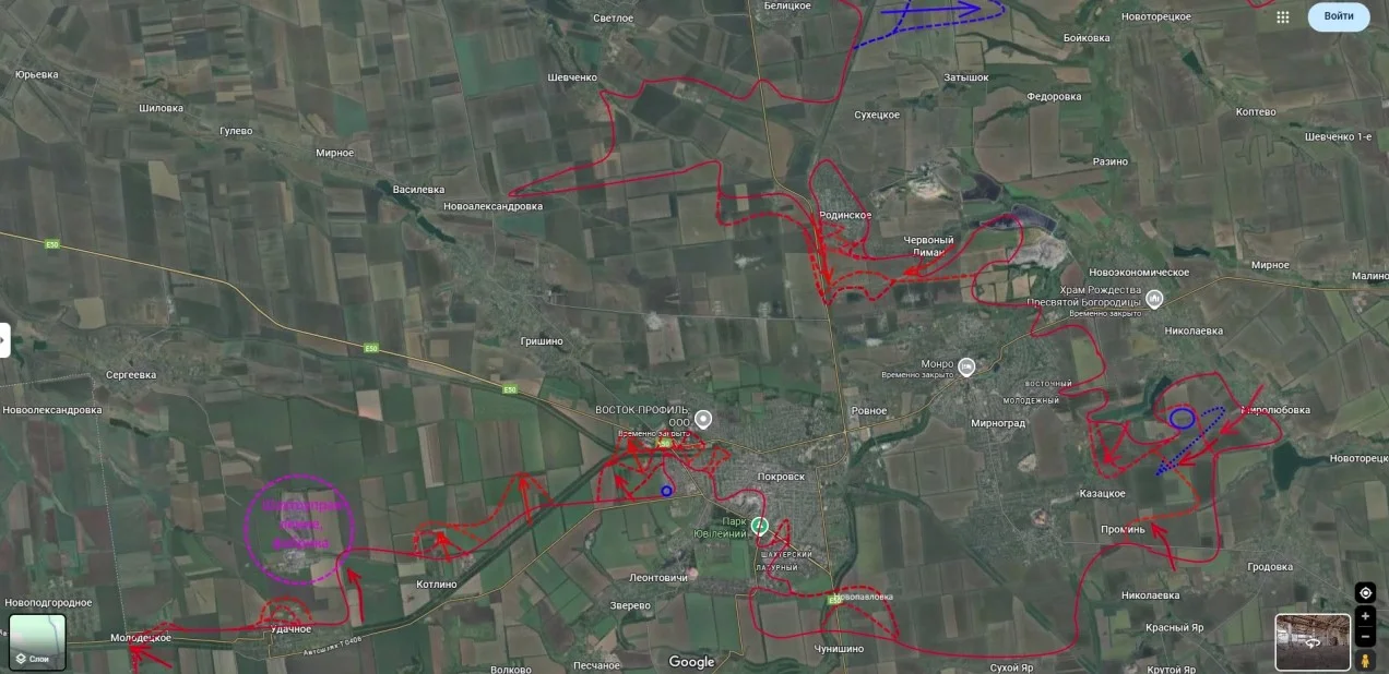 Одновременно развивается операция по охвату Родинского. Штурмовые группы продвигаются вдоль дороги от Родинского на Покровск, расширяя кольцо окружения. С запада российские подразделения заходят в частный сектор Родинского, завязывая городские бои. Ситуация для украинского гарнизона на этом участке становится катастрофической.