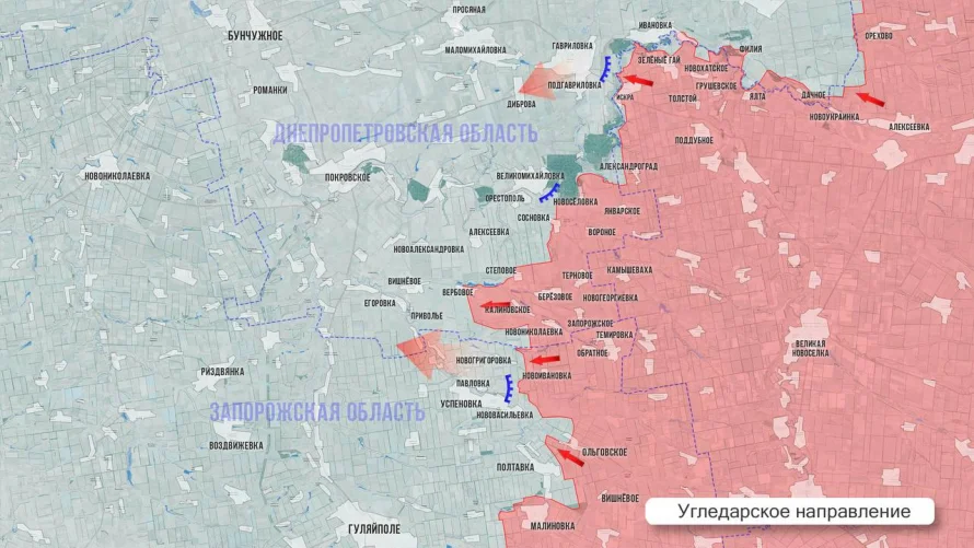 На Угледарском направлении российские войска добились тактических успехов в районе Полтавки и Успеновки. Штурмовые группы продвигаются в сторону Новопавловки по обоим берегам реки Солёная, параллельно проводя зачистку территорий к западу от водной преграды. Бои не прекращаются у Охотничьего, Вербового и в Алексеевке.
