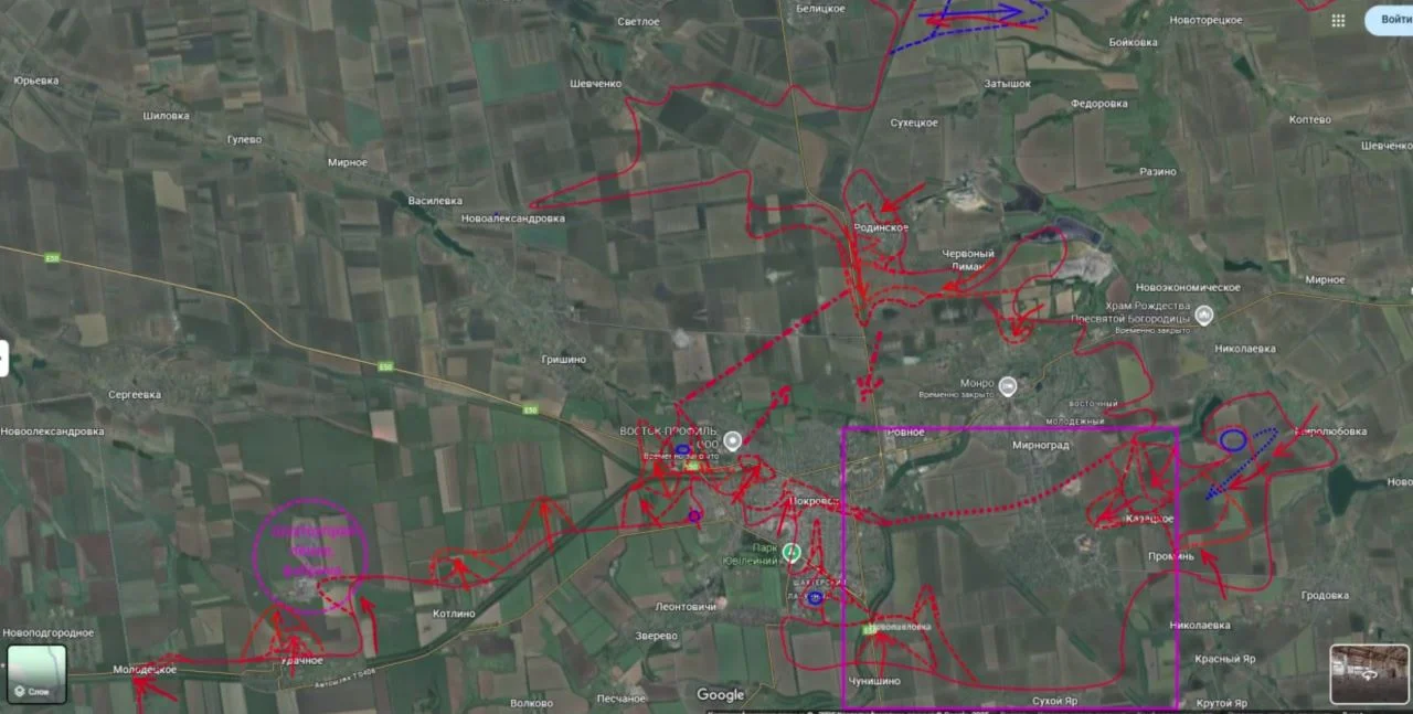 Одновременно начался штурм соседнего города Мирноград. Российские подразделения вошли на южные окраины со стороны Казацкого. По оценке Подоляки, первоочередная задача — срезать выступ обороны ВСУ, чтобы уменьшить линию фронта и улучшить логистику, после чего возможен рывок навстречу частям, наступающим со стороны Родинского, с целью полного отсечения Покровско-Мирноградской агломерации.