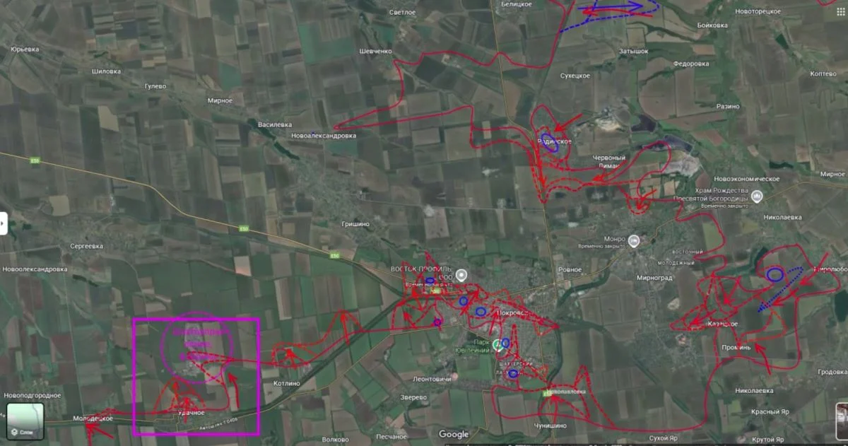 Главные события разворачиваются вокруг Покровской агломерации. Как отмечает Подоляка, оборона противника в самом Покровске, достигнув определенного предела, "начала сыпаться", что привело к быстрой "просадке" фронта.
