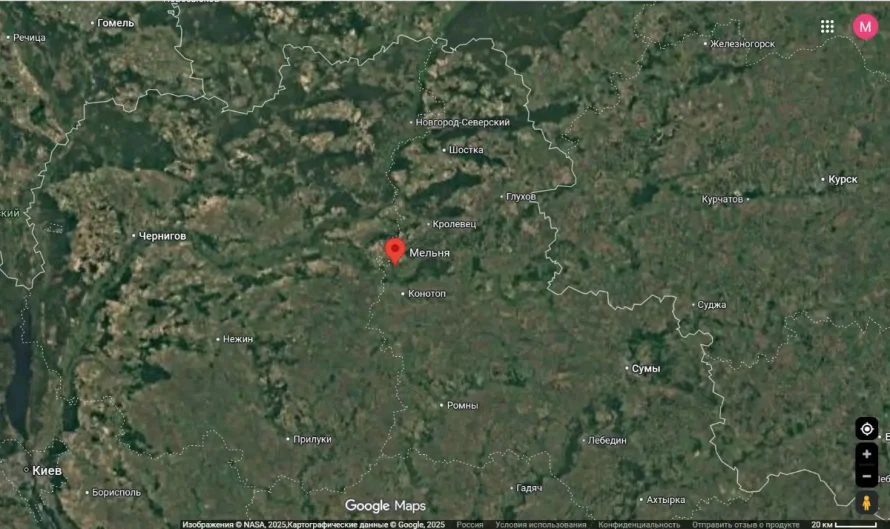 Удар был нанесен дроном "Герань-2" севернее Конотопа в Сумской области, в районе железнодорожной станции Мельня. Это примерно в 80 км от линии боевого соприкосновения.