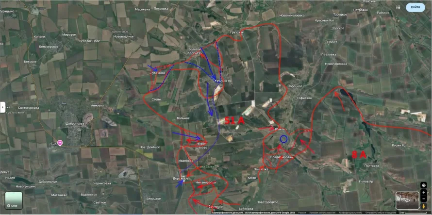 В-третьих, существует и более масштабная задача. После того как ВС РФ фактически окружили Покровск и Мирноград, успех на Добропольском участке может быть использован ВСУ для попытки деблокады своей отрезанной группировки.