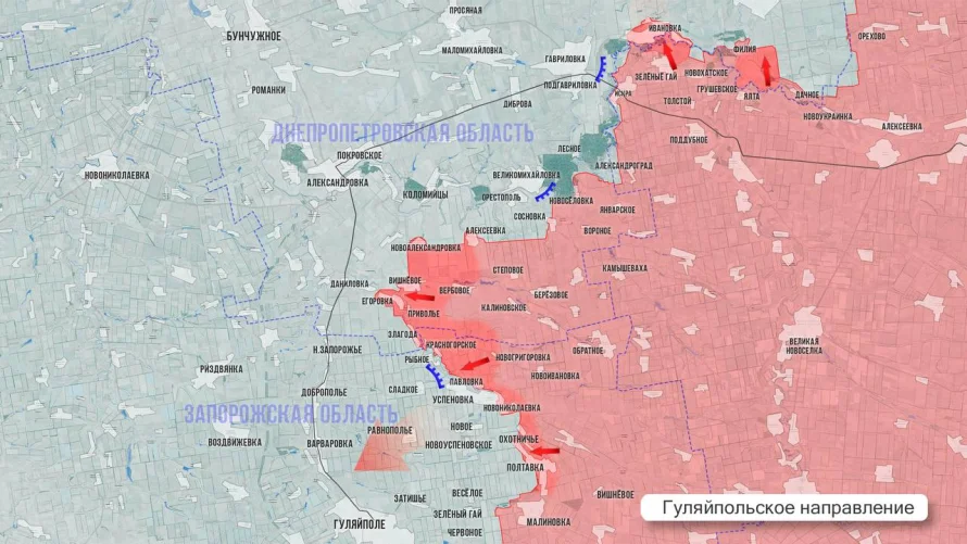 Между Алексеевкой и Новоалександровкой российские подразделения пробивают оборону ВСУ в направлении сел Тихое и Коломийцы. Из Ивановки штурмовые группы продвигаются на запад к Гавриловке, планомерно выбивая ВСУ из опорных пунктов к северу от села. Тяжелые бои идут в южной части Новопавловки.