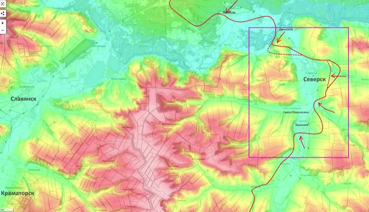 Северск: Город, по сути, обложен с трех сторон (север, восток, юг). Все предместья, по утверждению блогера, уже под контролем ВС РФ, бои идут на окраинах.