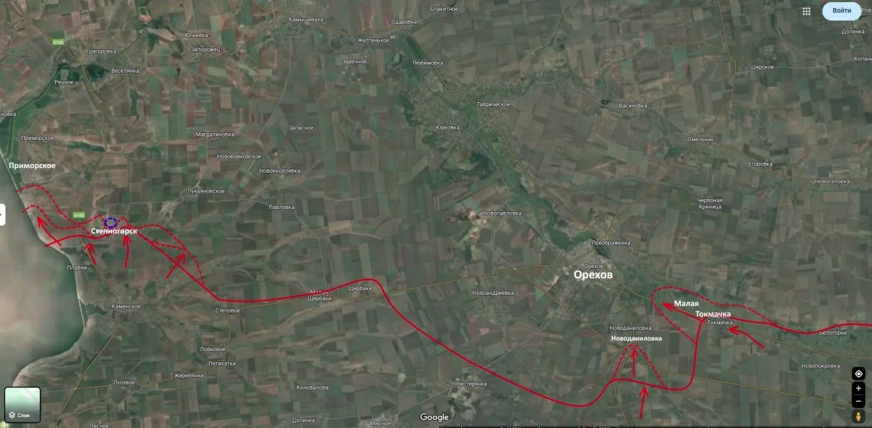 На южном участке фронта наши войска развивают успех. Группировка «Днепр» ведет активные бои в районе Степногорска и Приморского, овладевая ключевыми позициями. В районе Орехова зафиксирован важный тактический успех: кадры объективного контроля подтверждают заход наших штурмовиков в южную часть Новоданиловки и закрепление там. Таким образом, давление на Орехов идет с двух сторон: от Малой Токмачки и через Новоданиловку.