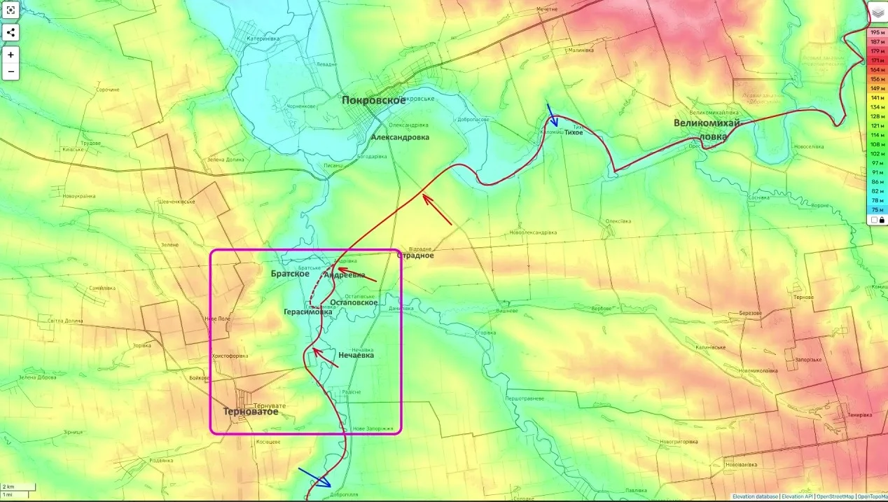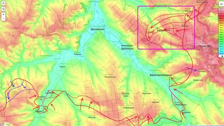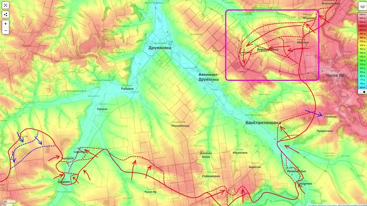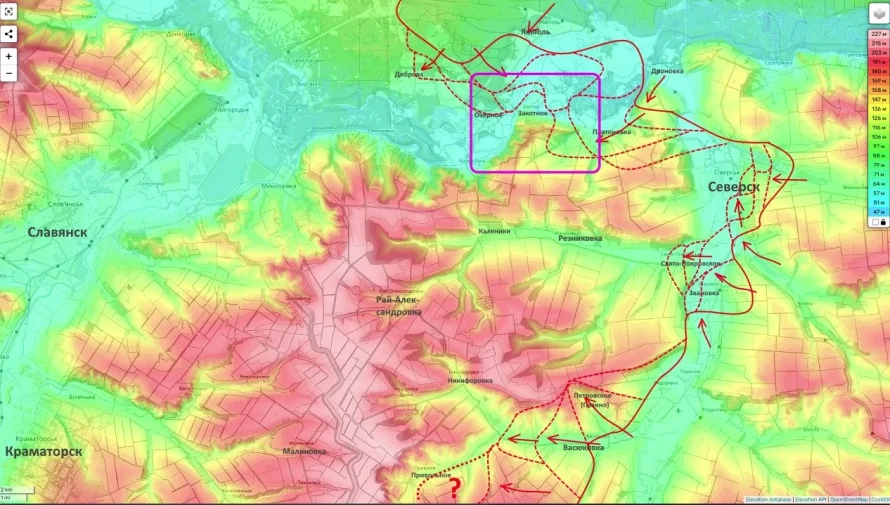 Ключевая задача здесь — взятие водораздельного хребта (вдоль канала «Северский Донец — Донбасс»). Контроль над этими господствующими высотами критически важен: это улучшает радиогоризонт для работы БПЛА и позволяет наносить удары вглубь обороны противника, одновременно защищая наши тылы.