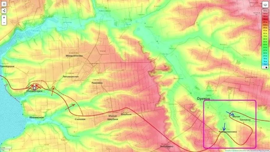 При этом особое значение имеет манёвр левого фланга ВС РФ, который «заворачивается» на северо-восток, фактически создавая условия для выхода в тыл ореховской группировки ВСУ. Такой разворот открывает перед российским командованием серьёзные оперативные возможности.