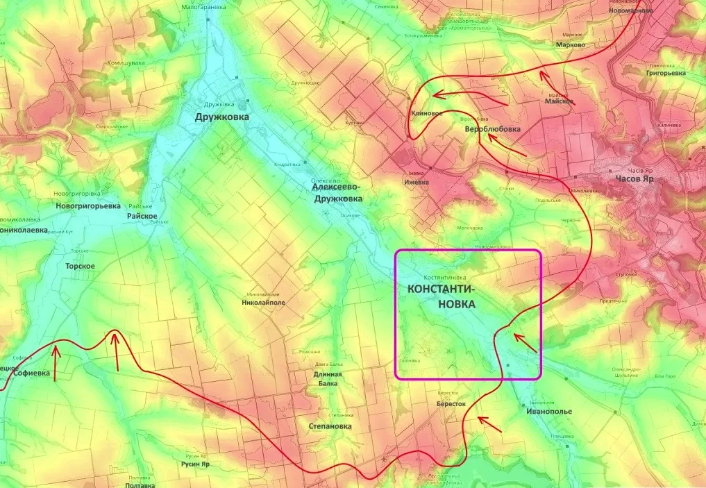 1. Северный охват. Российские войска расширяют прорыв в районе Веролюбовки. После завершения зачистки ее северо-западной части контуры северного охвата Константиновки будут полностью сформированы. Далее ожидается движение на Алексеево-Дружковку.