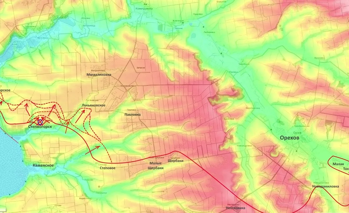 Степногорское направление. Здесь подразделения ВС РФ продолжают развивать успех, наступая от Степногорска сразу по трем векторам: на север, северо-восток и восток. Отмечаются тактические успехи, которые ставят противника в крайне сложное положение. Особенно критична ситуация для ВСУ в районе Приморского, где российские штурмовики продвигаются вперед с целью стабилизации фронта. Маневр украинских сил здесь скован, пространство для отхода сокращается.